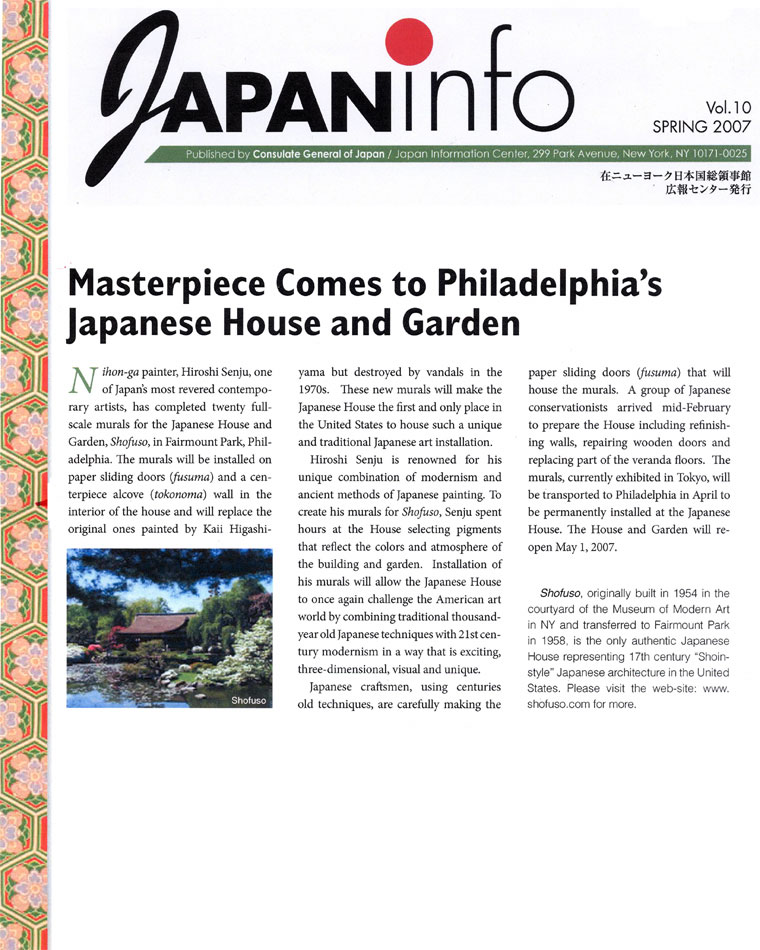 "Hiroshi Senju, one of Japan's most revered and internationally acclaimed contemporary artists, will complete his work in December of 2006 on a set of 27 syohekiga murals to be donated to Shofuso."