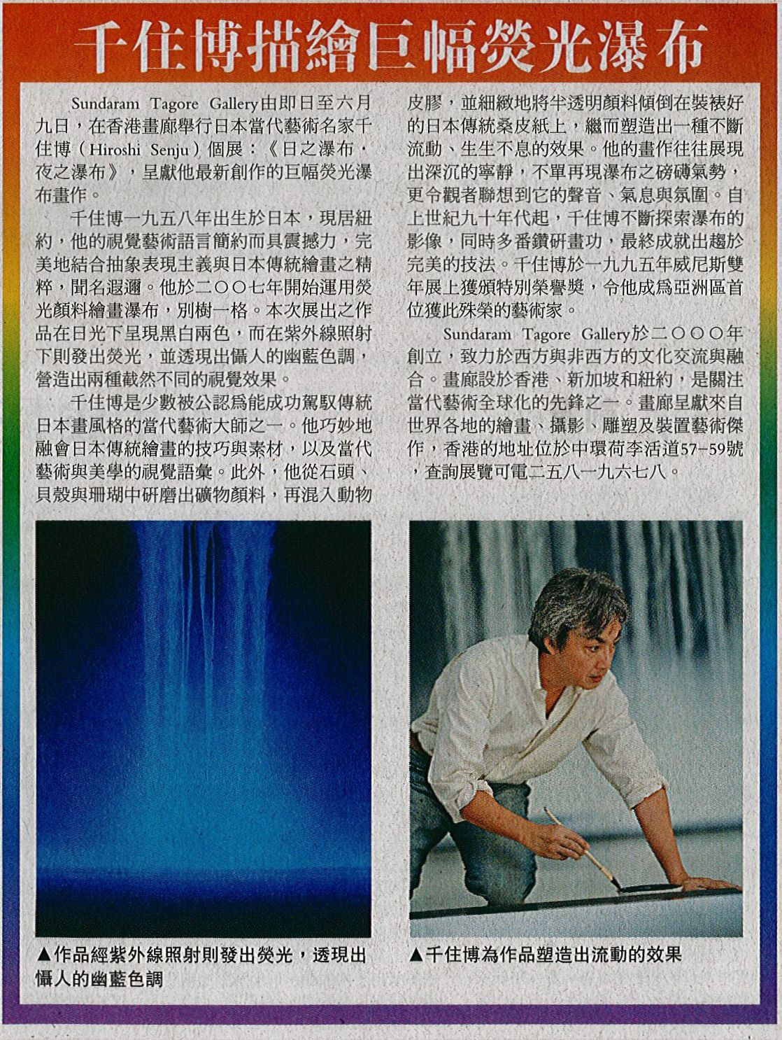 "It would be no exaggeration to call the works of Hiroshi Senju 'out of this world.' In his first solo show in Hong Kong at Sundaram Tagore Gallery, the celebrated Japanese artist reveals a new dimension to his inner vision. Transcendence flows through his sublime waterfalls and fills the landscape of canyons and cliffs, in a series of new works that are unveiled especially for the local audience."