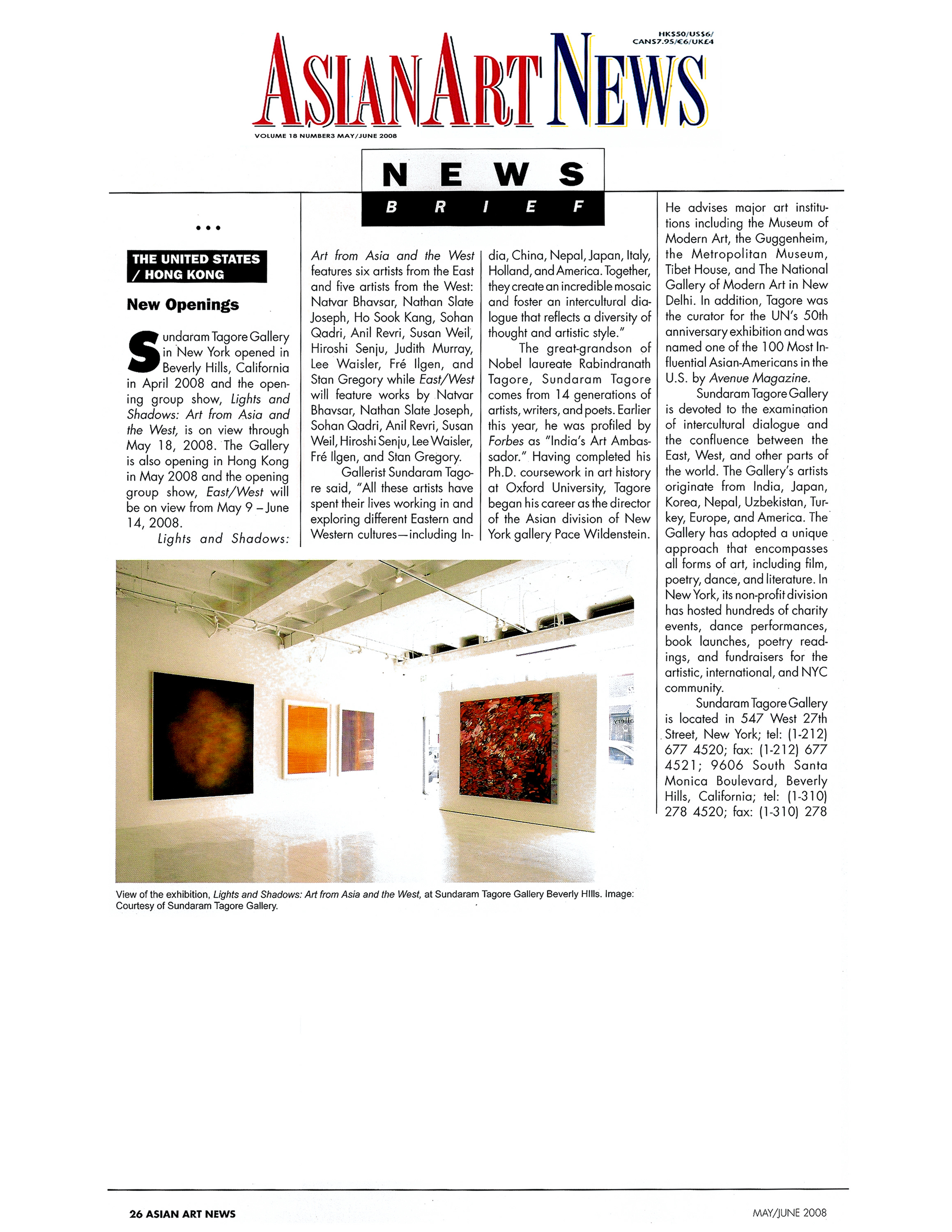"The Art section of Hong Kong International Art and Antiques Fair 2009 will feature exceptional works by celebrated artists in a diversity of artistic styles and media. Sundaram Tagore Gallery of New York, Beverly Hills and Hong Kong will show work that encourages a dialogue between the East and West. Featured artists include Hiroshi Senju(Japan), Sohan Qadri (India) and Kim Joon (Korea) along with Susan Weil (USA), Natvar Bhavsar (India)."