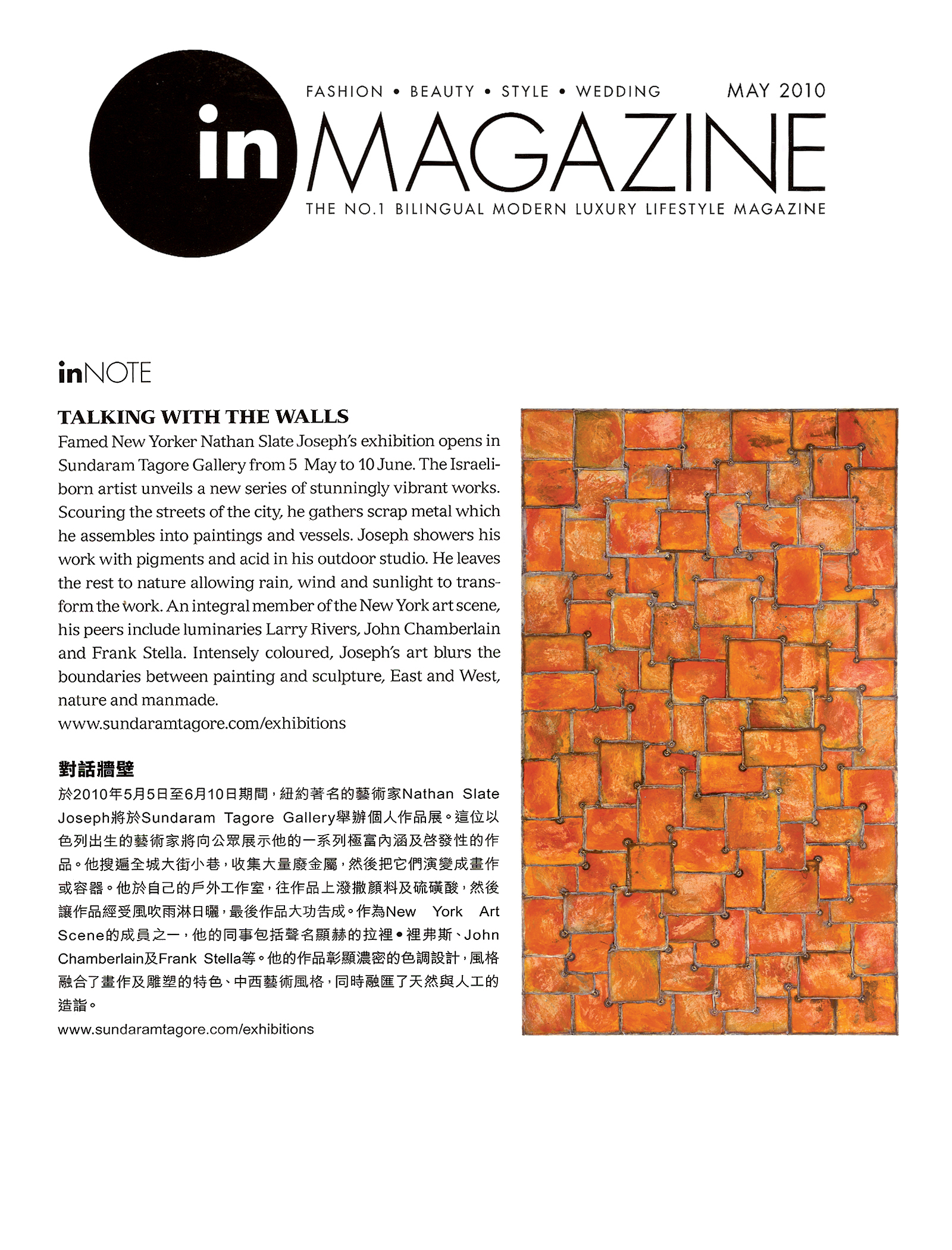 "Famed New Yorker Nathan Slate Joseph's exhibition opens in Sundaram Tagore Gallery from May 5 – June 10. The Israeli-born artist unveils a new series of stunningly vibrant works. Scouring the streets of the city, he gathers scrap metal which he assembles into paintings and vessels. Intensely coloured, Joseph's art blurs the boundaries between painting and sculpture, East and West, nature and the manmade."
