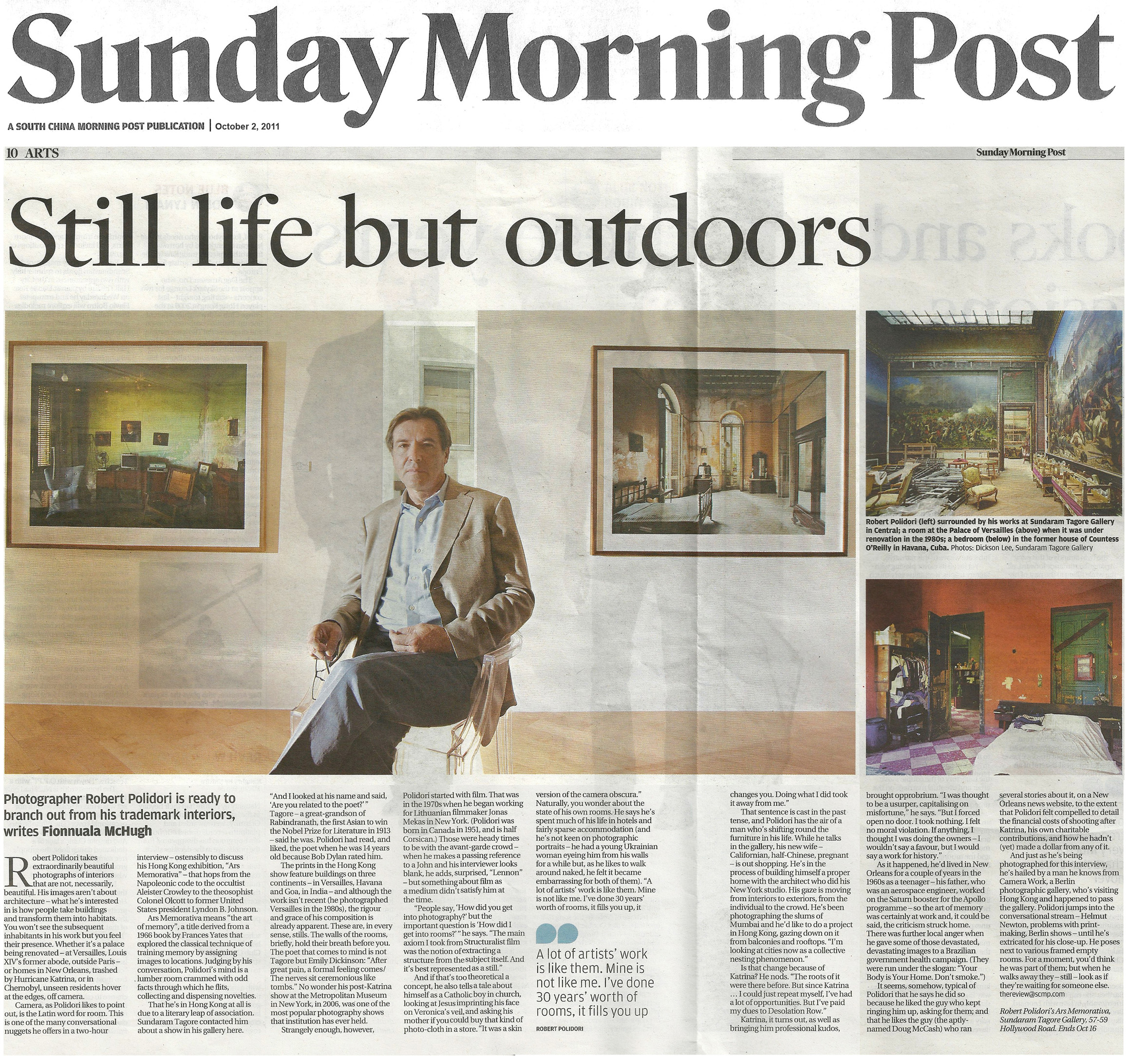 Robert Polidori以其充滿情感,隨著時間逝去或人物轉變而變幻無常的室內攝影,對人類棲息地作心理上的探索。他曾於世界各地拍攝,包括哈瓦那曾風光一時的豪宅殘餘、印度果阿殖民地時代建築、貝魯特記載戰爭痕跡的庭院、切爾諾貝爾核事故後的廢墟、中國及迪拜的城市住宅等等。2006年,他受紐約大都會博物館委託,為新奧爾良受颶風卡特里娜襲擊後的情況作攝影紀錄。
