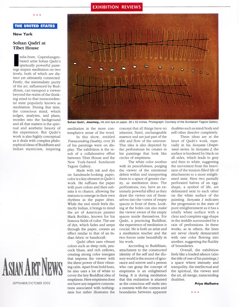 Informed by Eastern spiritual traditions, the art of Sohan Qadri neither evokes thought nor connects the viewer to anything outside itself; like meditation, it turns the attention inwards. (Vibhuti Patel)