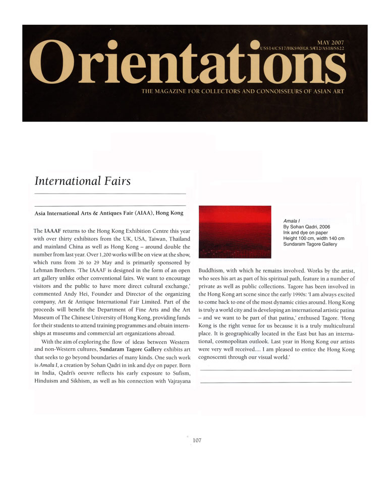 "The Art section of Hong Kong International Art and Antiques Fair 2009 will feature exceptional works by celebrated artists in a diversity of artistic styles and media. Sundaram Tagore Gallery of New York, Beverly Hills and Hong Kong will show work that encourages a dialogue between the East and West. Featured artists include Hiroshi Senju(Japan), Sohan Qadri (India) and Kim Joon (Korea) along with Susan Weil (USA), Natvar Bhavsar (India)."