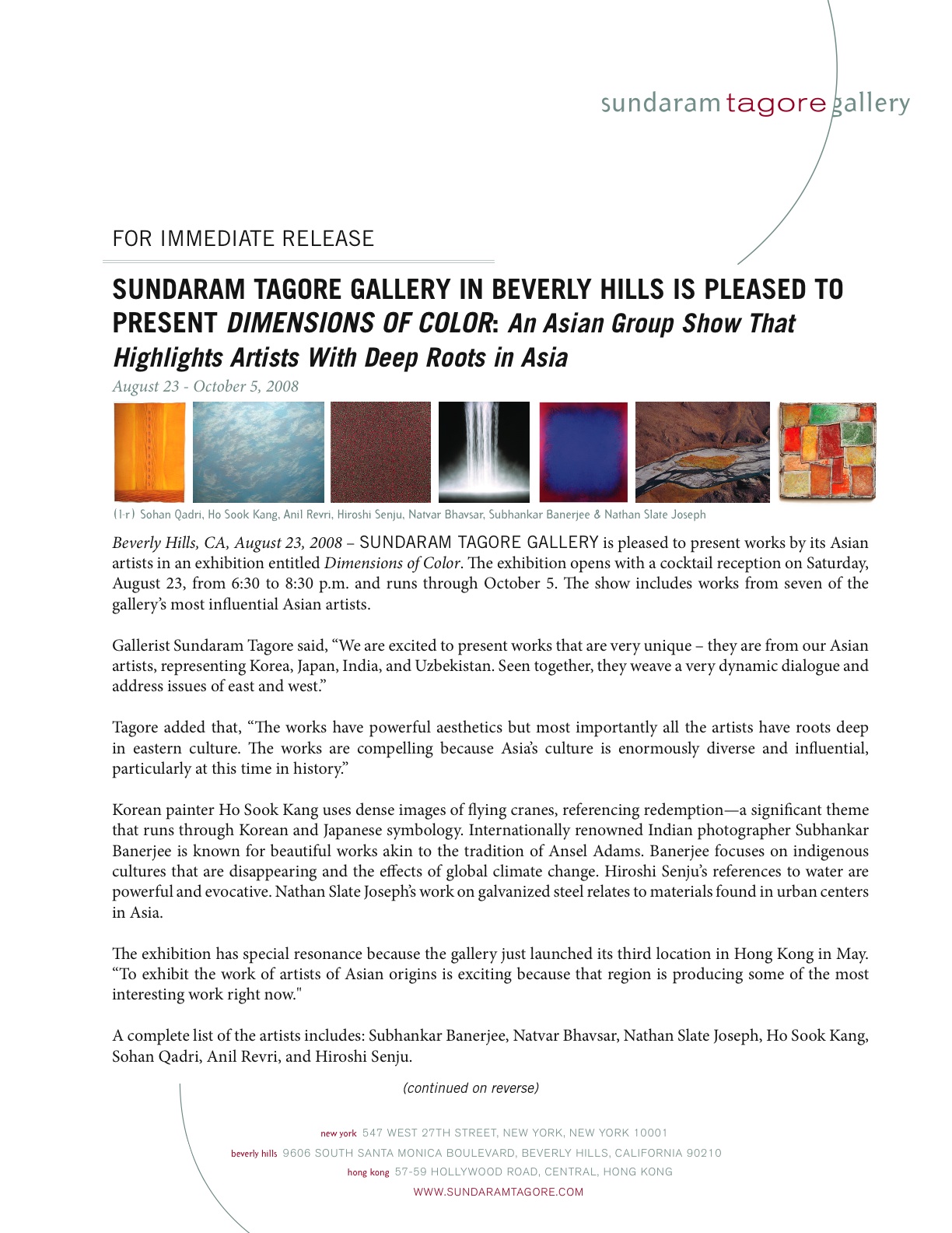 Gallerist Sundaram Tagore said, "We are excited to present works that are very unique – they are from our Asian artists, representing Korea, Japan, India, and Uzbekistan. Seen together, they weave a very dynamic dialogue and address issues of east and west." Tagore added that, "The works have powerful aesthetics but most importantly all the artists have roots deep in eastern culture. The works are compelling because Asia's culture is enormously diverse and influential, particularly at this time in history."