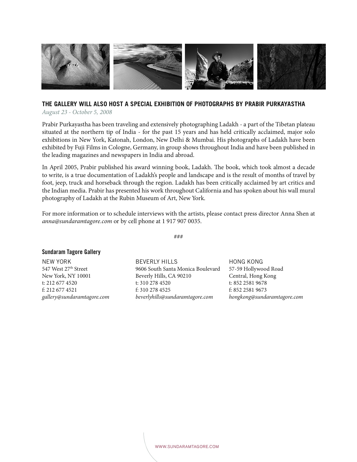 In April 2005, Prabir published his award winning book, Ladakh. The book, which took almost a decade to write, is a true documentation of Ladakh's people and landscape and is the result of months of travel by foot, jeep, truck and horseback through the region. Art critics and the Indian media have critically acclaimed Ladakh. Prabir has presented his work throughout California and has spoken about his wall mural photography of Ladakh at the Rubin Museum of Art, New York.