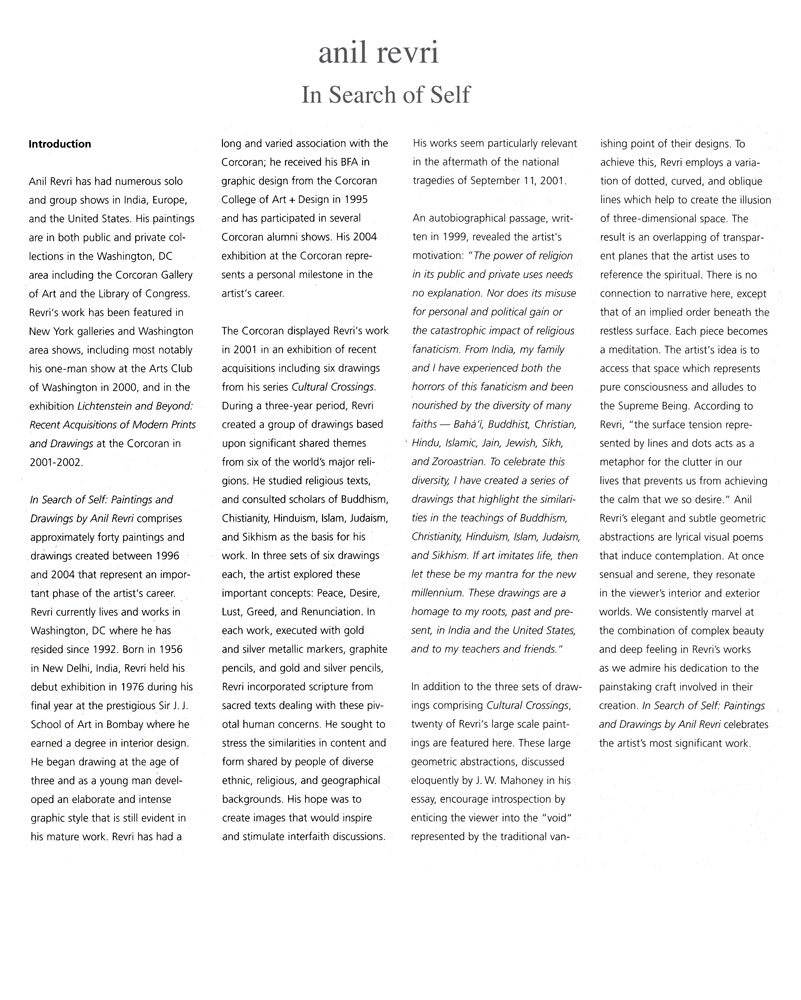 WASHINGTON, DC— Noted Washington, DC-based artist Anil Revri creates contemplative images that allude to the spiritual. His geometric abstractions encourage introspection by drawing the viewer into the "void" represented by negative space. To achieve this, the artist uses a variation of dotted, curved and oblique lines which help create the illusion of three-dimensional space. On view at the Corcoran from June 5 through September 13, 2004, In Search of Self: Paintings and Drawings by Anil Revri – a retrospective – continues Revri's long association with the Corcoran Gallery of Art.