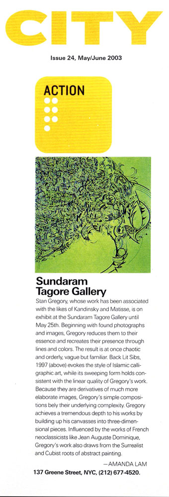 "Stan Gregory[s] . . . work has been associated with the likes of Kandinsky and Matisse . . . [He] evokes the style of Islamic calligraphic art"