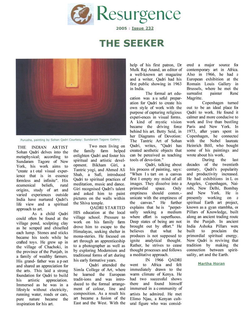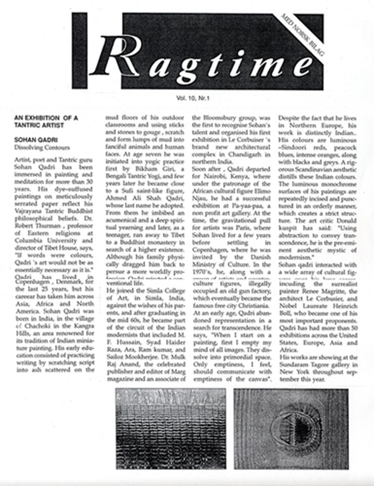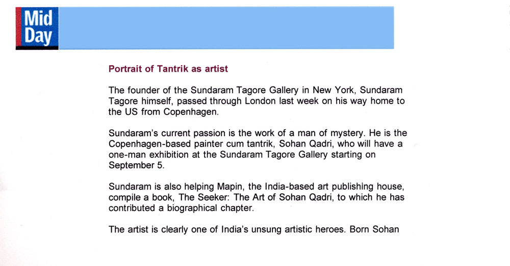 "Sundaram's current passion is the work of a man of mystery. He is the Copenhagen-based painter cum tantrik, Sohan Qadri, who will have a one-man exhibition at the Sundaram Tagore Gallery starting on September 5."