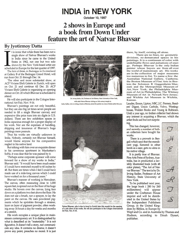 "A recognition of [Bhavsar's] place in the mainstream art world today was the release on Oct. 15 of a book on Bhavsar, written by a noted authority on American art, irving Sandler, and published by Craftsman House of Australia, at a reception at the home of noted art collectors Pat and Ben Heller, ...titled "Natvar Bhavsar: Painting and the Reality of Color," contain[ing] 42 plates of color that reproduce the complexities and nuances of the original, which ordinarily elude reproduction, with notable fidelity."