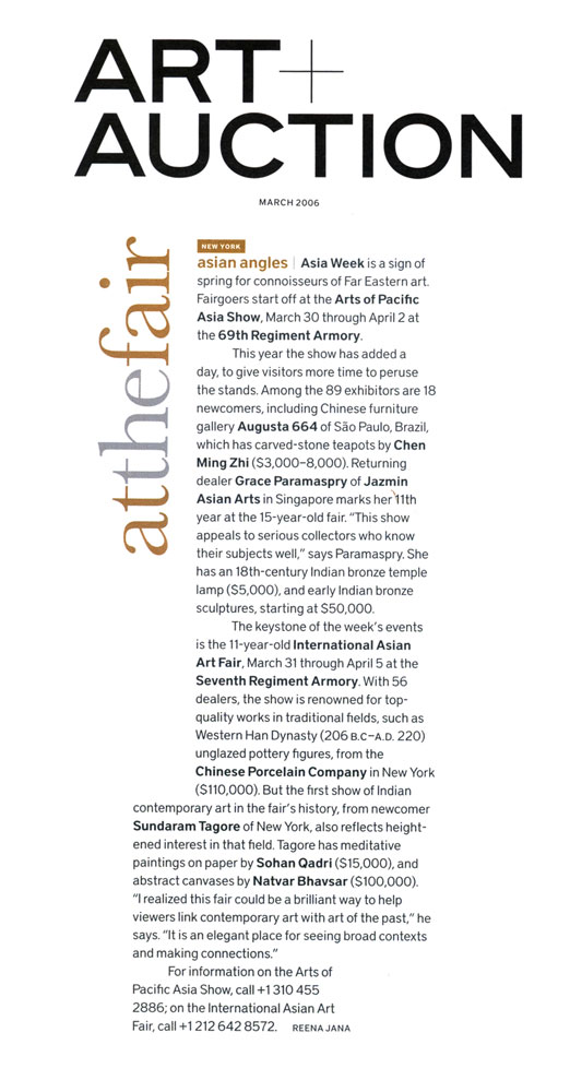 "But the first show of Indian contemporary art in the fair's history, from newcomer Sundaram Tagore of New York, also reflects heightened interest in that field Tagore has meditative paintings on paper by Sohan Qadri.."