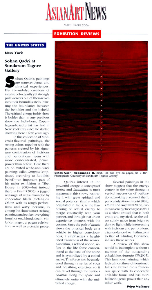 "In particular, Qadri's color choices--mercury reds, peacock blues, and even stark black and grays-- underscore his Indian roots, while his sense of form points to his philosophical inclinations."