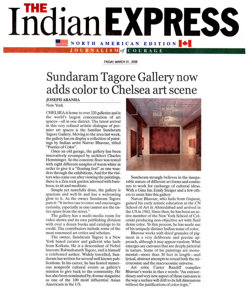 "Sundaram Tagore Gallery has announced that they will relocate to a new space at 547 West 27th Street in Chelsea and inaugurate their new gallery with a show of Natvar Bhavsar to open on March 16, 2006."