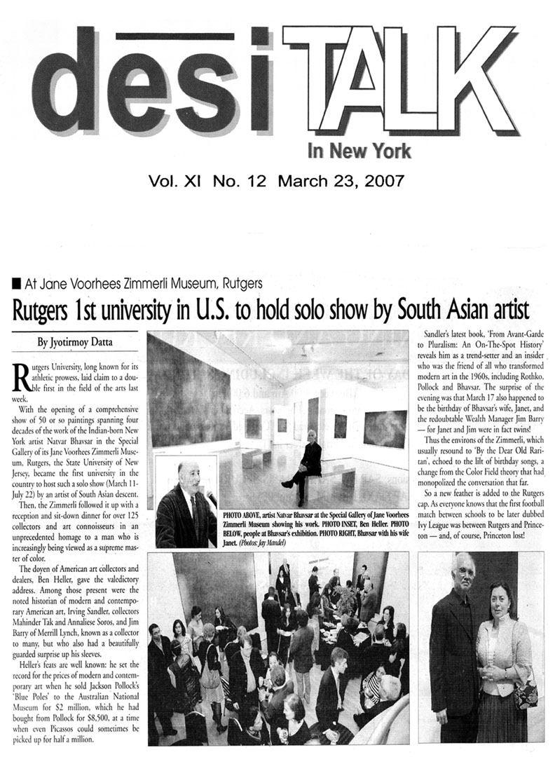 "...With the opening of a comprehensive show of 50 or more paintings spanning four decades of the work of Indian-born New York artist Natvar Bhavsar in the special gallery of its Jane Vorhees Zimmerli Museum, Rutgers, the State University of New Jersey, became the first university in the country to host such a solo show (March 11 - July 22) by an artist of South Asian Descent..."