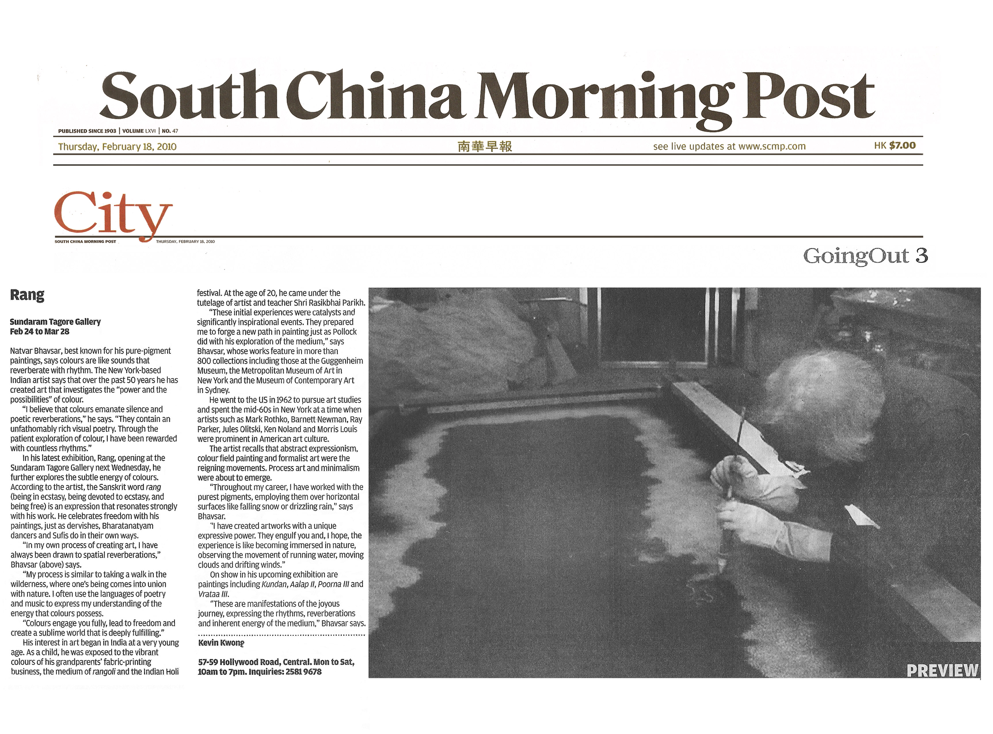 "Yet the absence of recognizable imagery in his work aligns Mr. Bhavsar more with American traditions of abstract art, and in particular color field painting; one is reminded variously of the work of the American painters Mark Rothko, Barnett Newman and Jules Olitski."